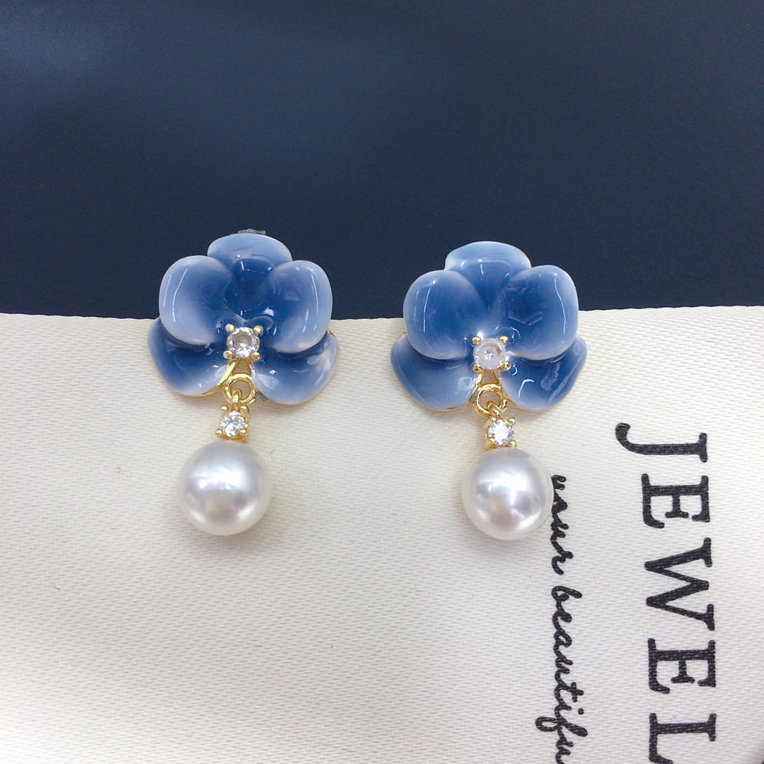 诸暨天然淡水珍珠耳钉新中式梦幻蓝滴油蝴蝶兰花朵珍珠耳环