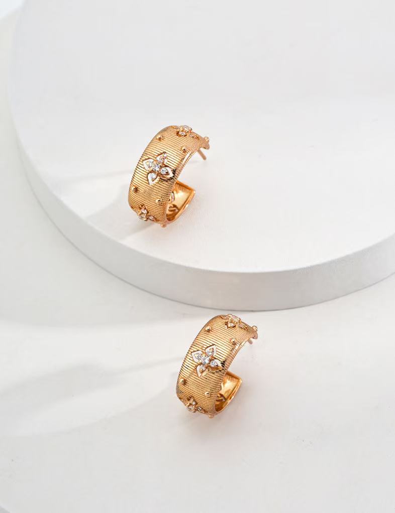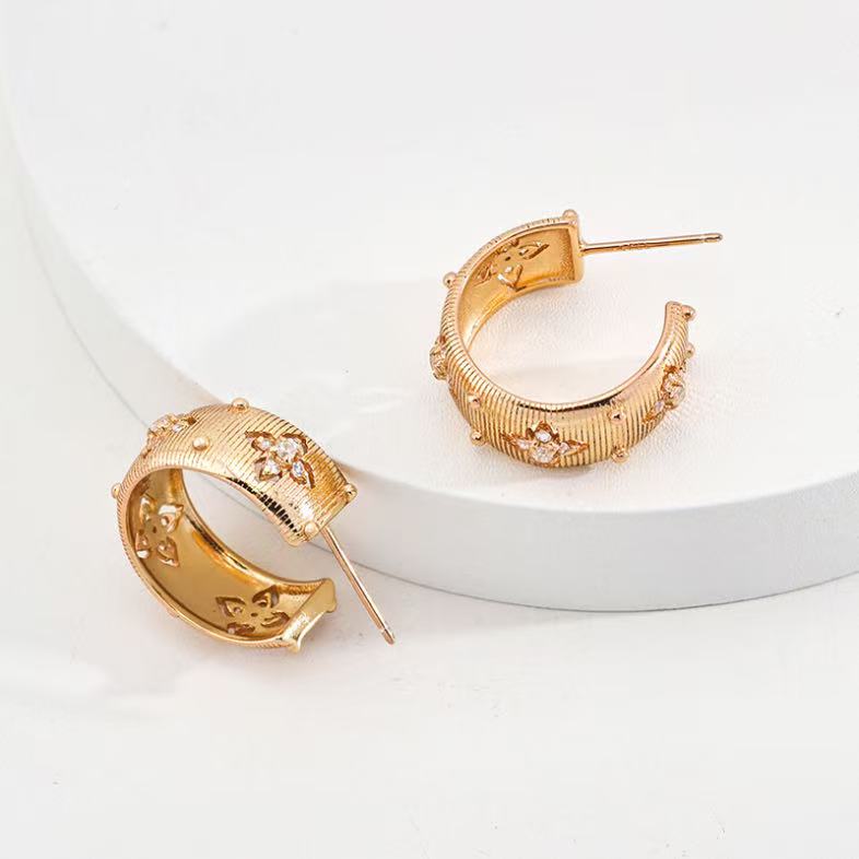 Crafted with fine copper and plated for a lasting golden glow, these hoops feature delicate crystal details that shimmer with every movement. A perfect balance of elegance and charm, they are designed to brighten both your daily style and evening looks.